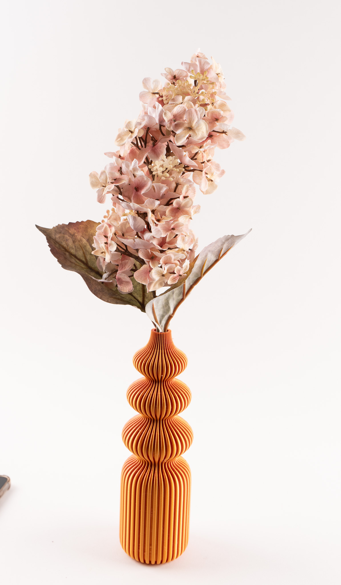 De vaas, uitgevoerd in een warme oranje tint, heeft de herkenbare golvende vormen en fijne verticale lijnen die zorgen voor een speels en modern effect. De zachte, lichtroze hortensia bloemen vormen hier een prachtig contrast mee en geven de set een natuurlijke en serene uitstraling.