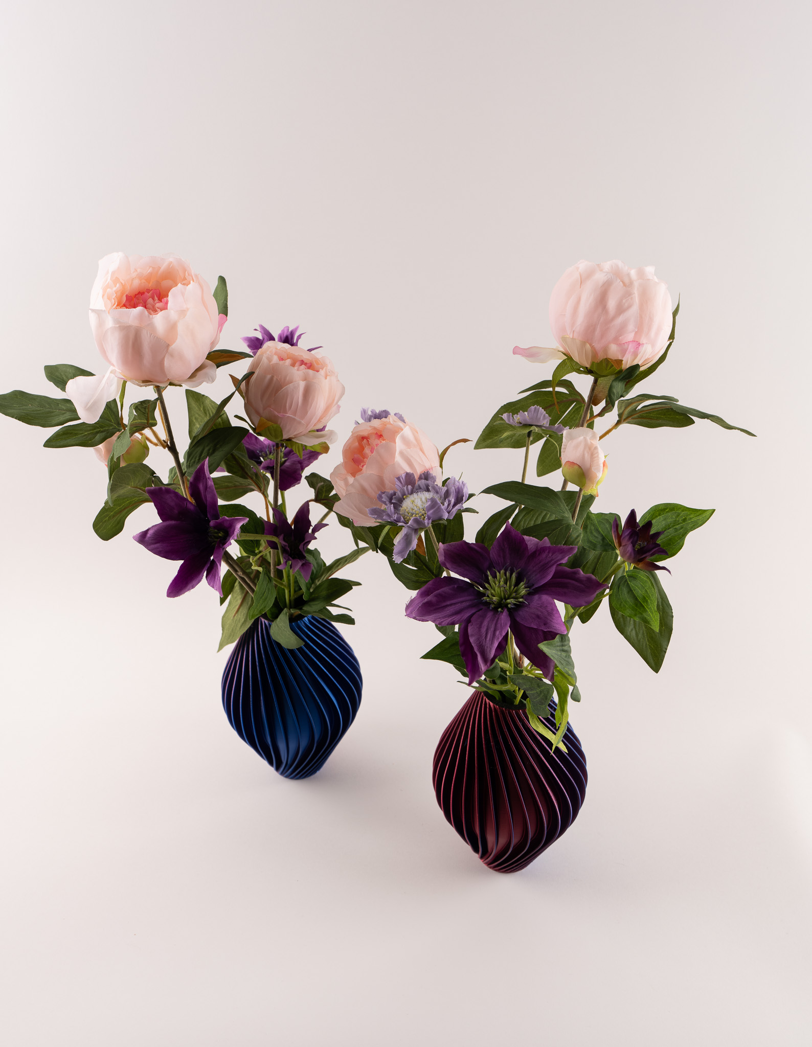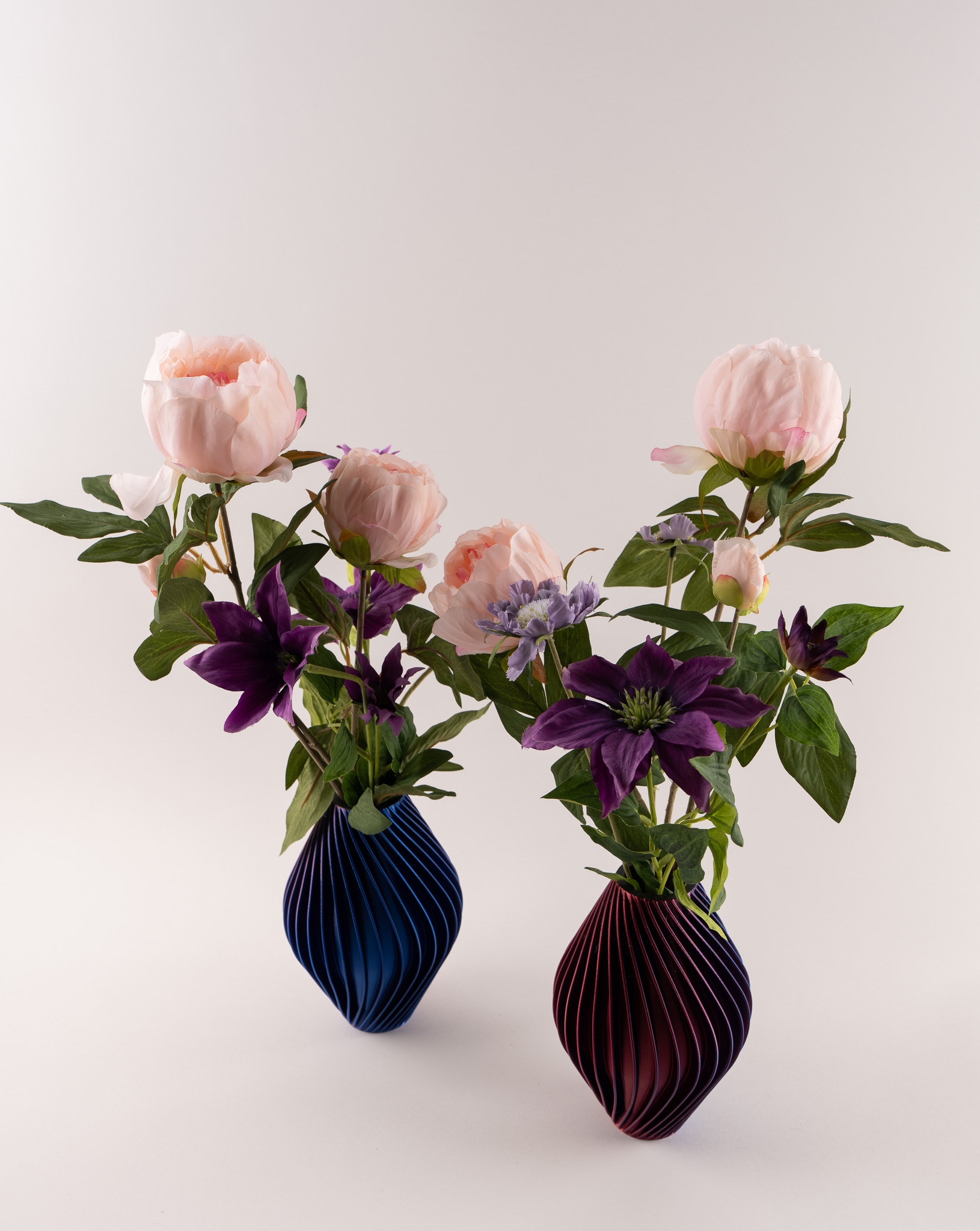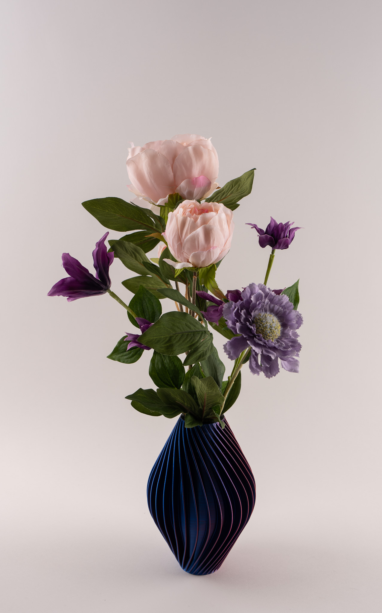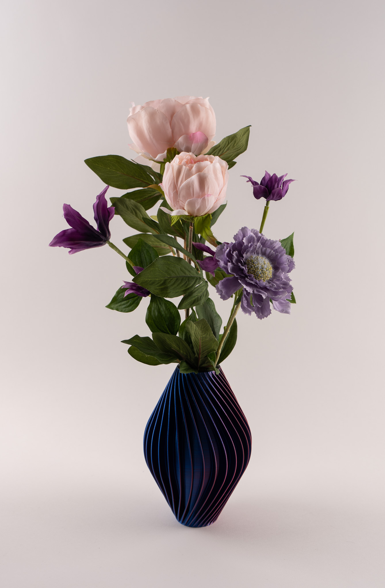 Vaas Diva doet haar naam eer aan. Met haar verfijnde verticale lijnen en diepe blauw-paarse tint straalt zij kracht, elegantie en karakter uit. Gevuld met zachte pioenrozen en speelse scabiosa ontstaat een stijlvolle balans tussen romantiek en modern design. De rijke kleuren van de bloemen versterken het luxe karakter van de vaas, waardoor dit arrangement een echte eyecatcher is in elk interieur.