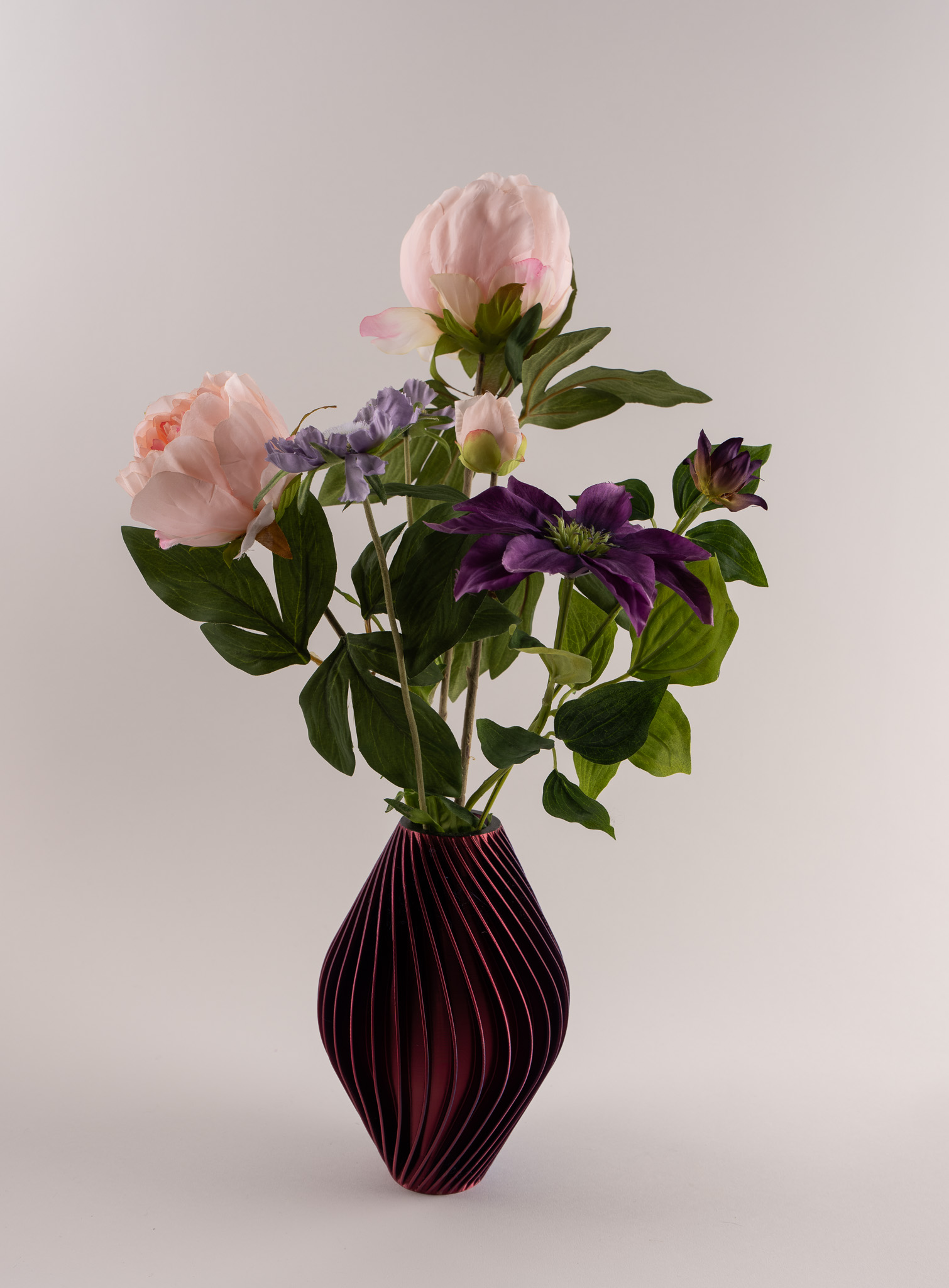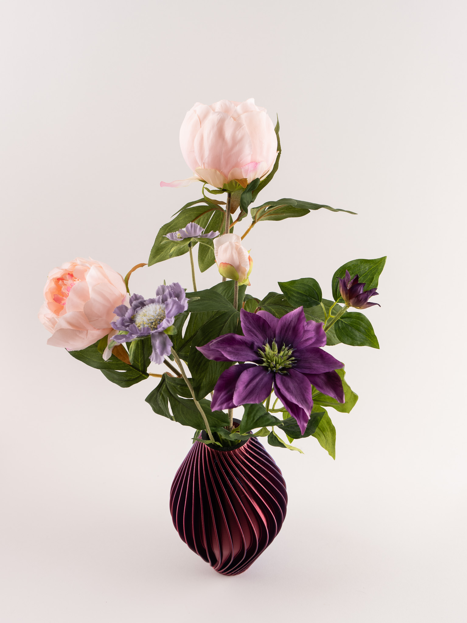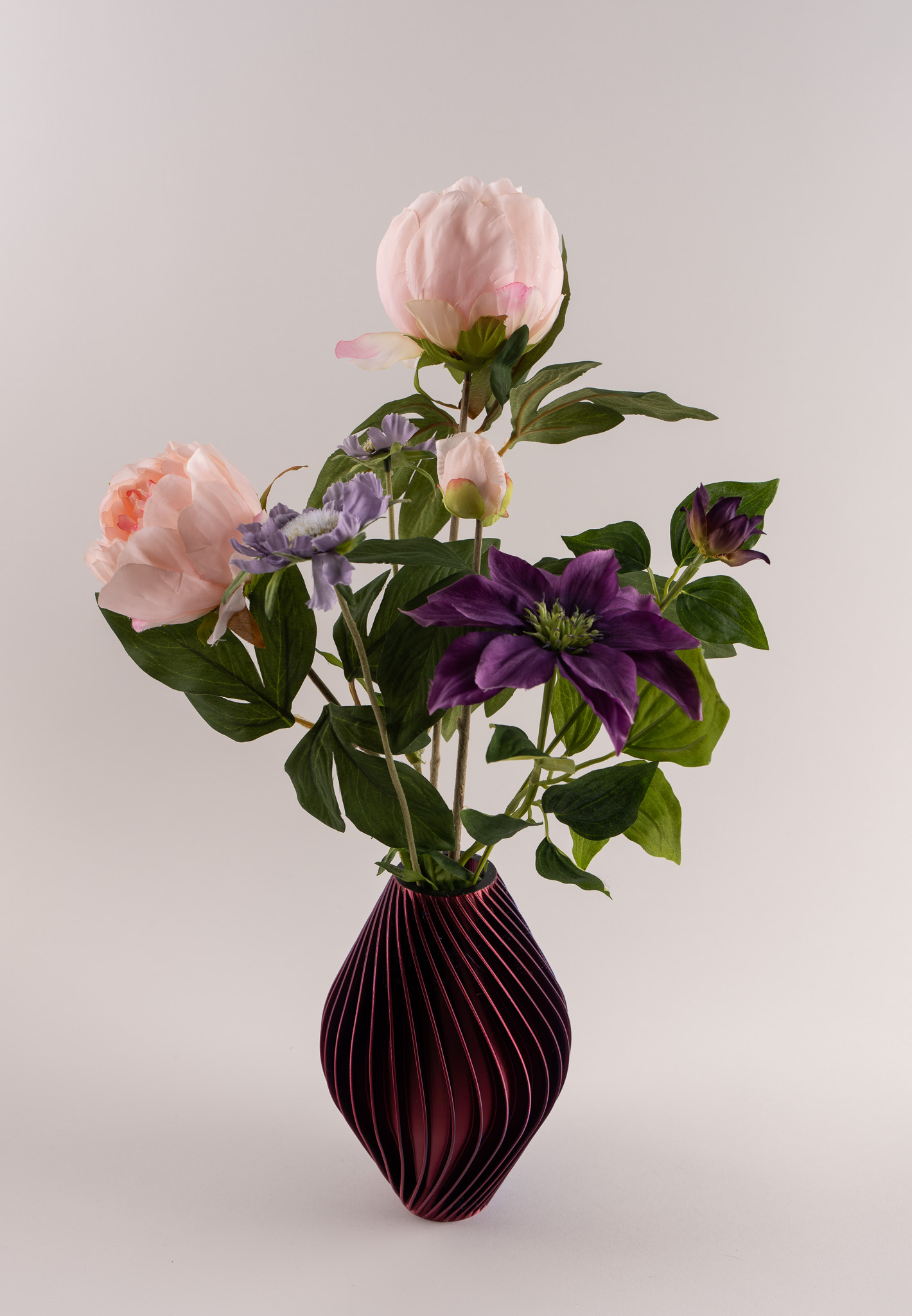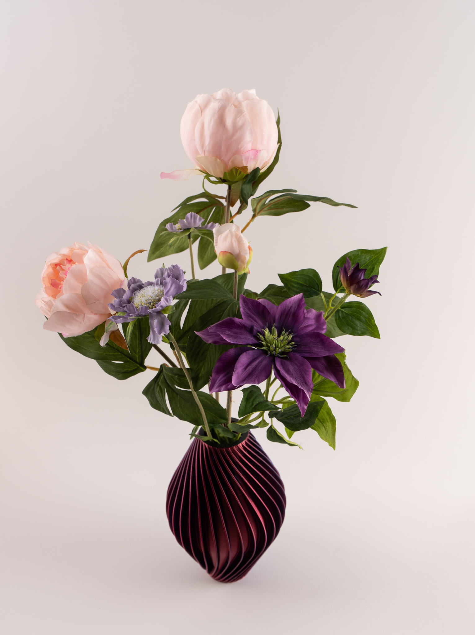 Vaas Diva doet haar naam eer aan. Met haar verfijnde verticale lijnen en diepe blauw-paarse tint straalt zij kracht, elegantie en karakter uit. Gevuld met zachte pioenrozen en speelse scabiosa ontstaat een stijlvolle balans tussen romantiek en modern design. De rijke kleuren van de bloemen versterken het luxe karakter van de vaas, waardoor dit arrangement een echte eyecatcher is in elk interieur.