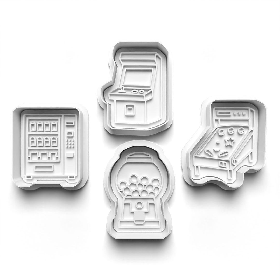 Deze unieke set bestaat uit vier nostalgische designs: een arcade machine, flipperkast, snoepautomaat en vending machine. Perfect voor iedereen die houdt van retro vibes, gaming en speelse bakcreaties.